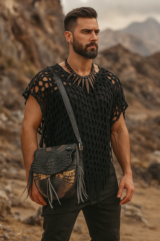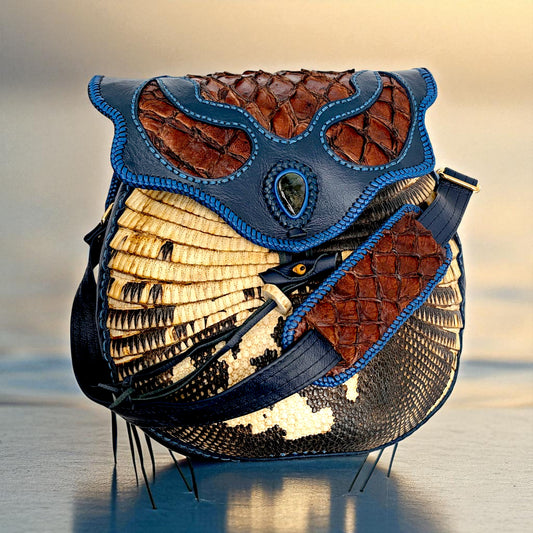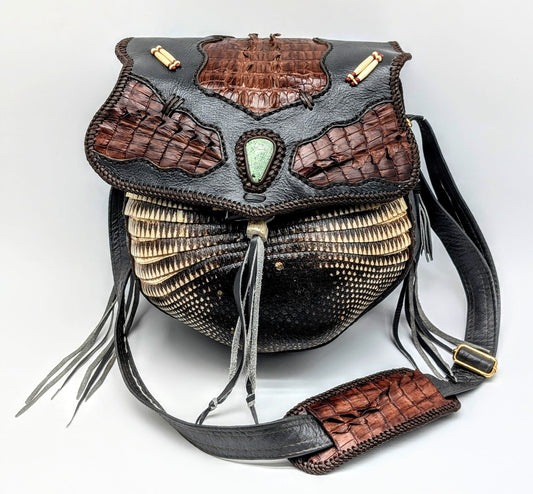Artisan Armadillo Shell Bag with Alligator Hornback Crown, Obsidian Stone & Antler – One of a Kind