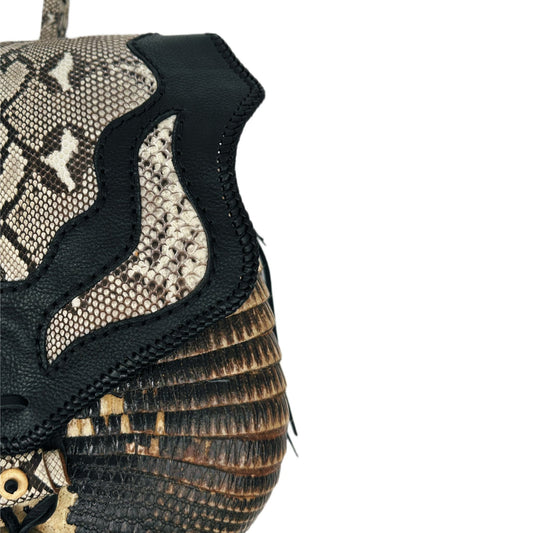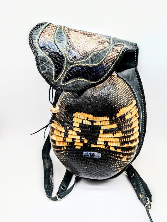 Bohemian Armadillo Snakeskin Whipstitch Leather Backpack with Antler Bone Closure, Bohemian Bag with Armadillo Shell and Fringe Charm
