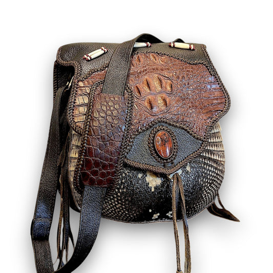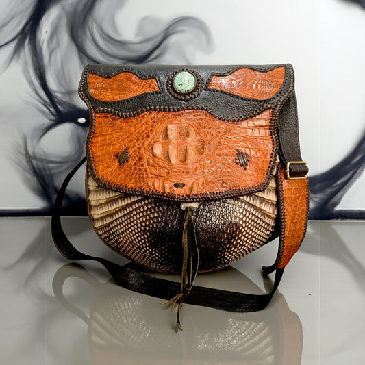 Bohemian Armadillo Shell Alligator Tail Flap Whipstitch Leather Bag with Turquoise Stone, Antler Bone Closure and Fringe