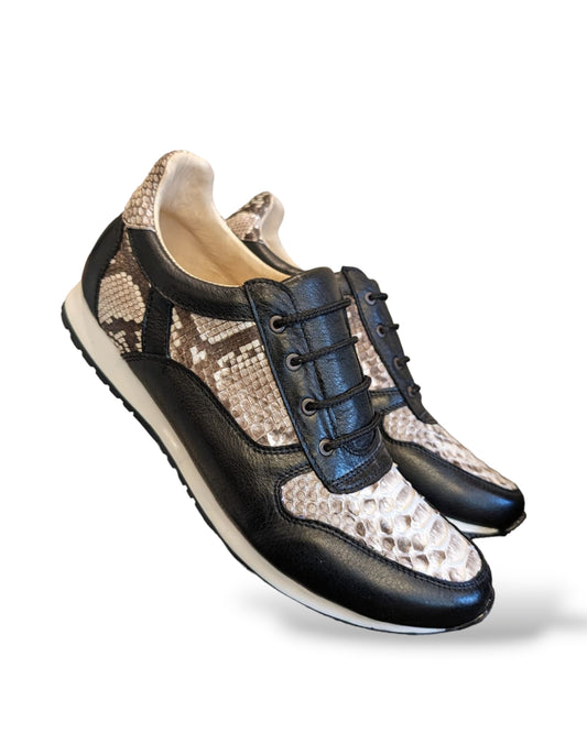 Natural Snakeskin and Black Leather Lace Up Sneaker Shoes
